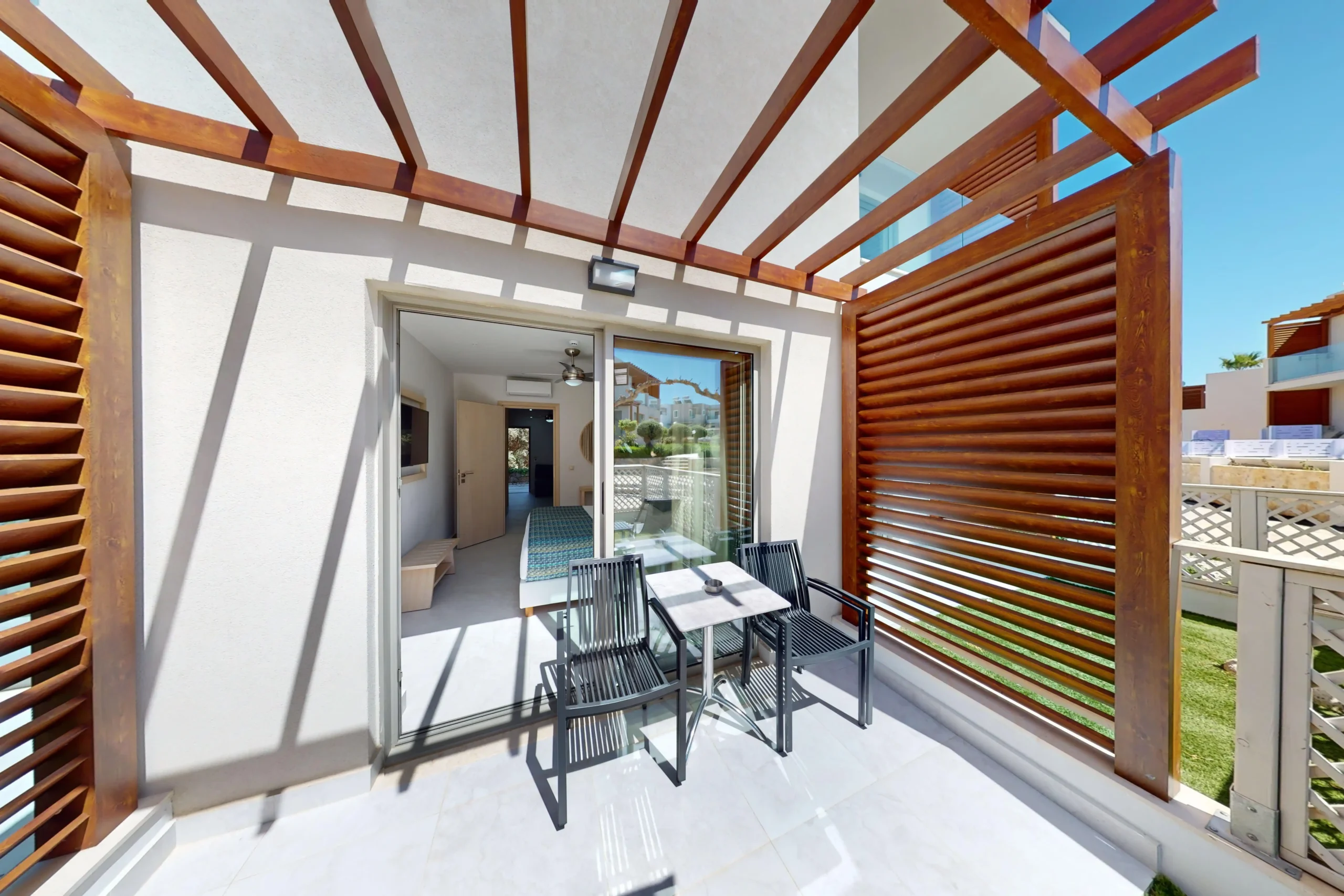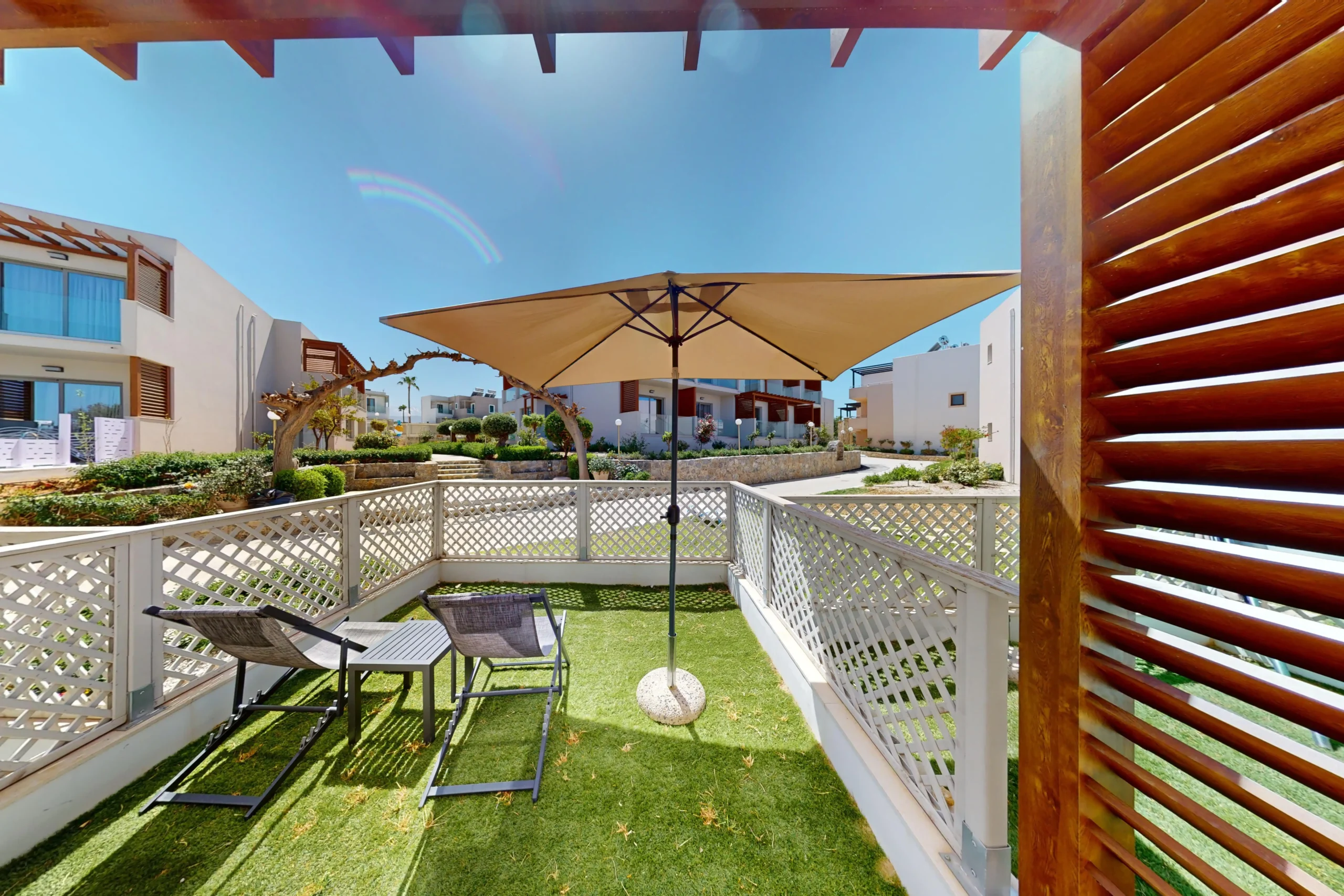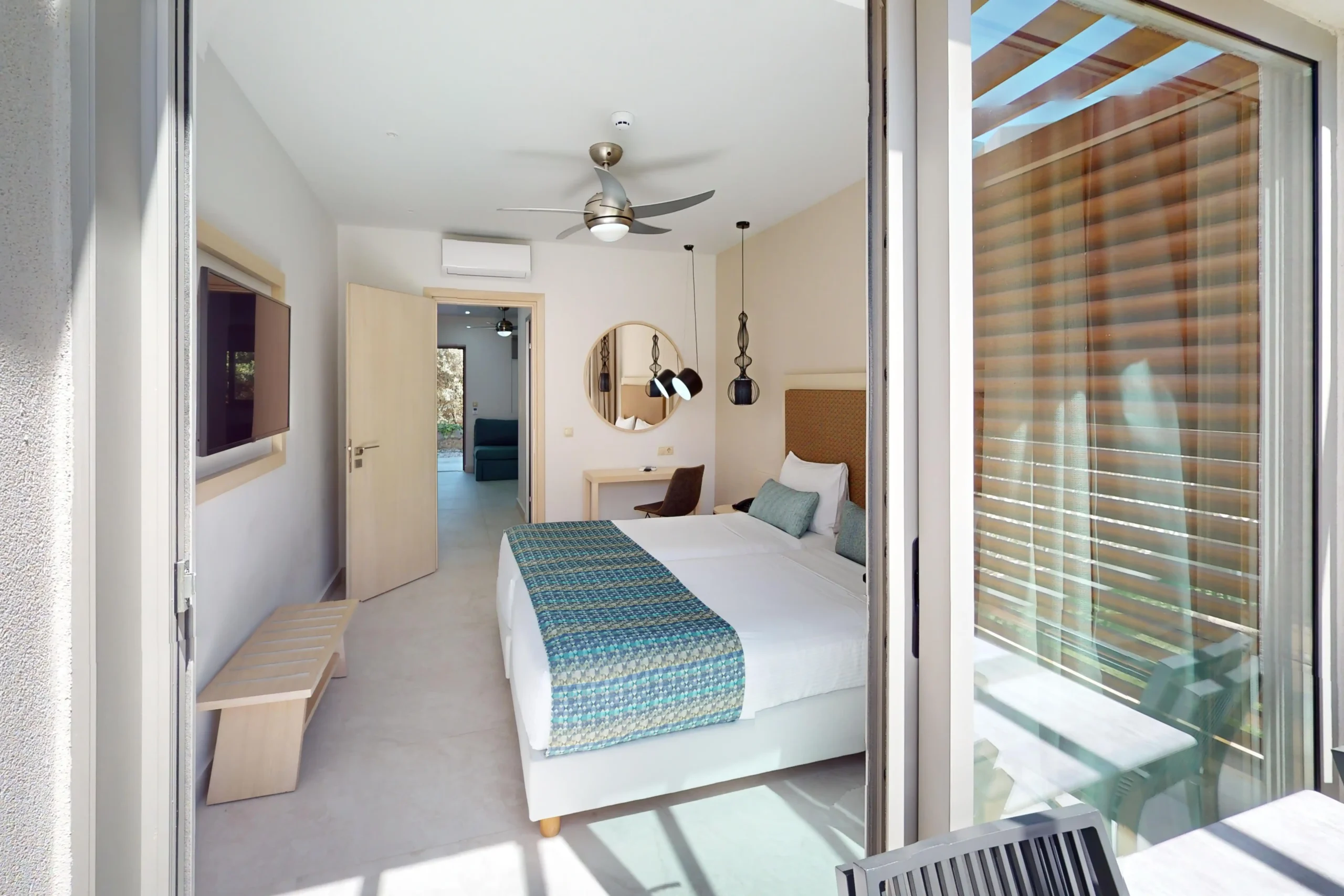 Fully refurbished and nestled within charming bungalows, this room features a private terrace enclosed by a fence and finished with a soft synthetic grass floor. Enjoy added comfort with a deckchair and parasol for relaxing outdoors in a safe, family friendly setting.