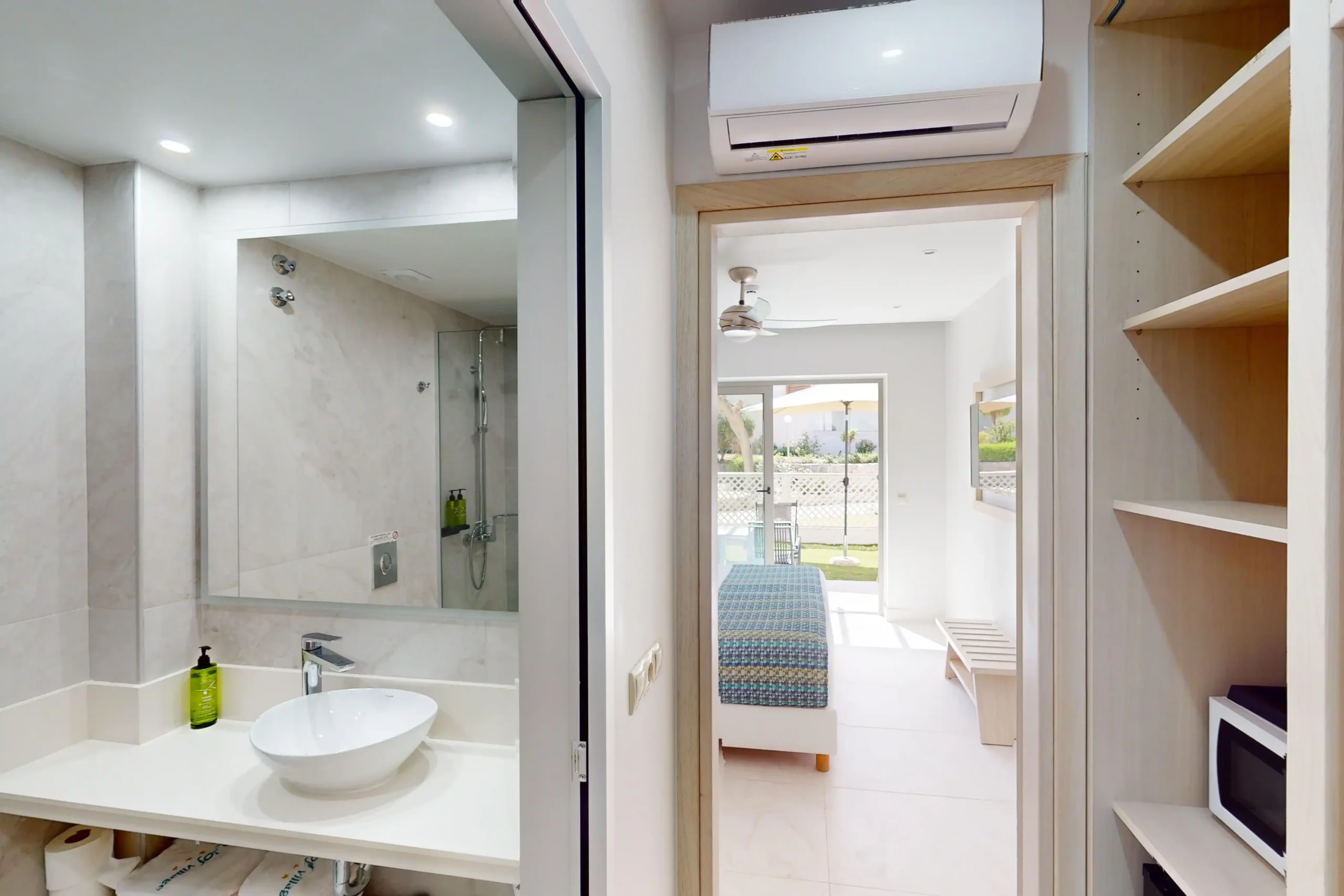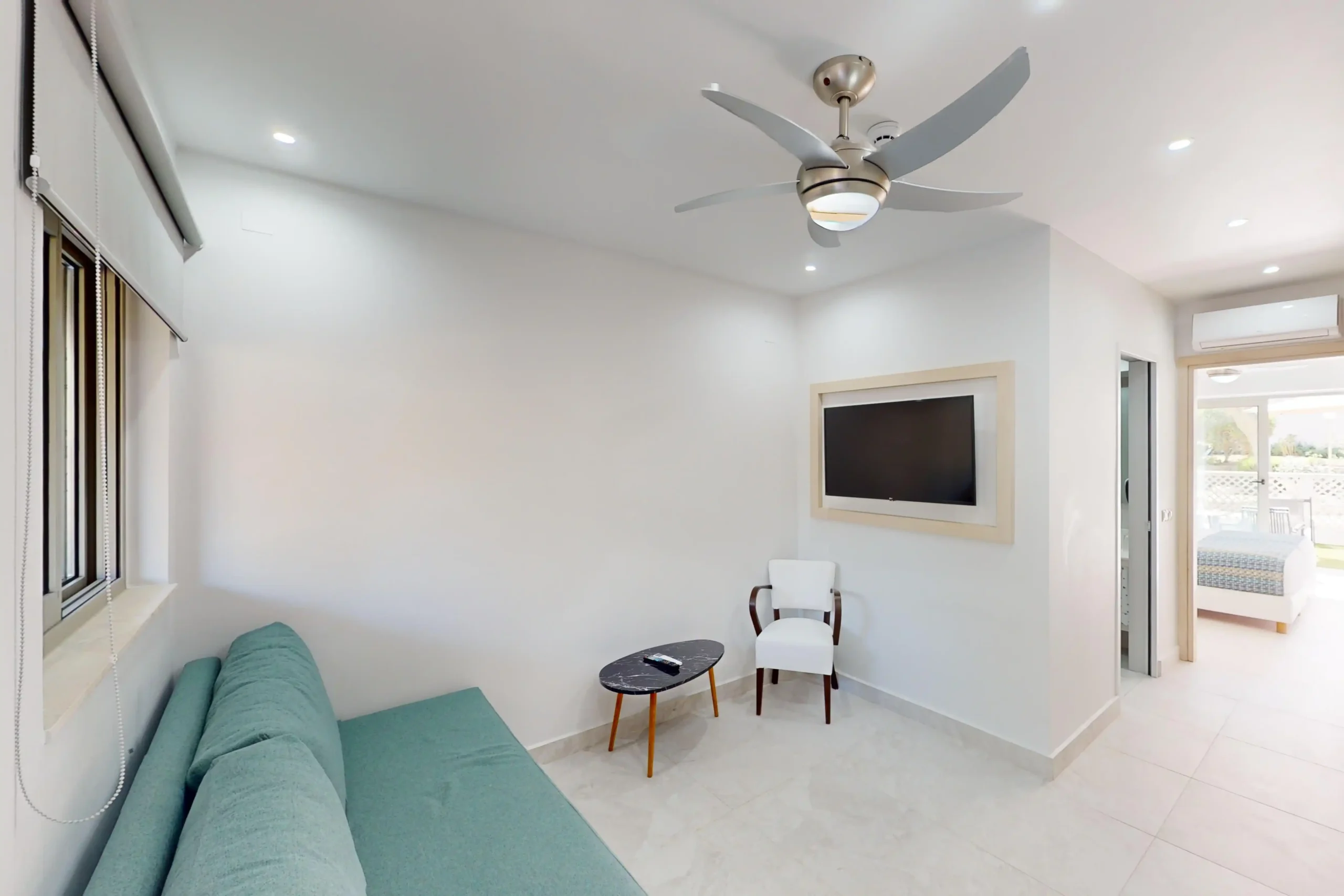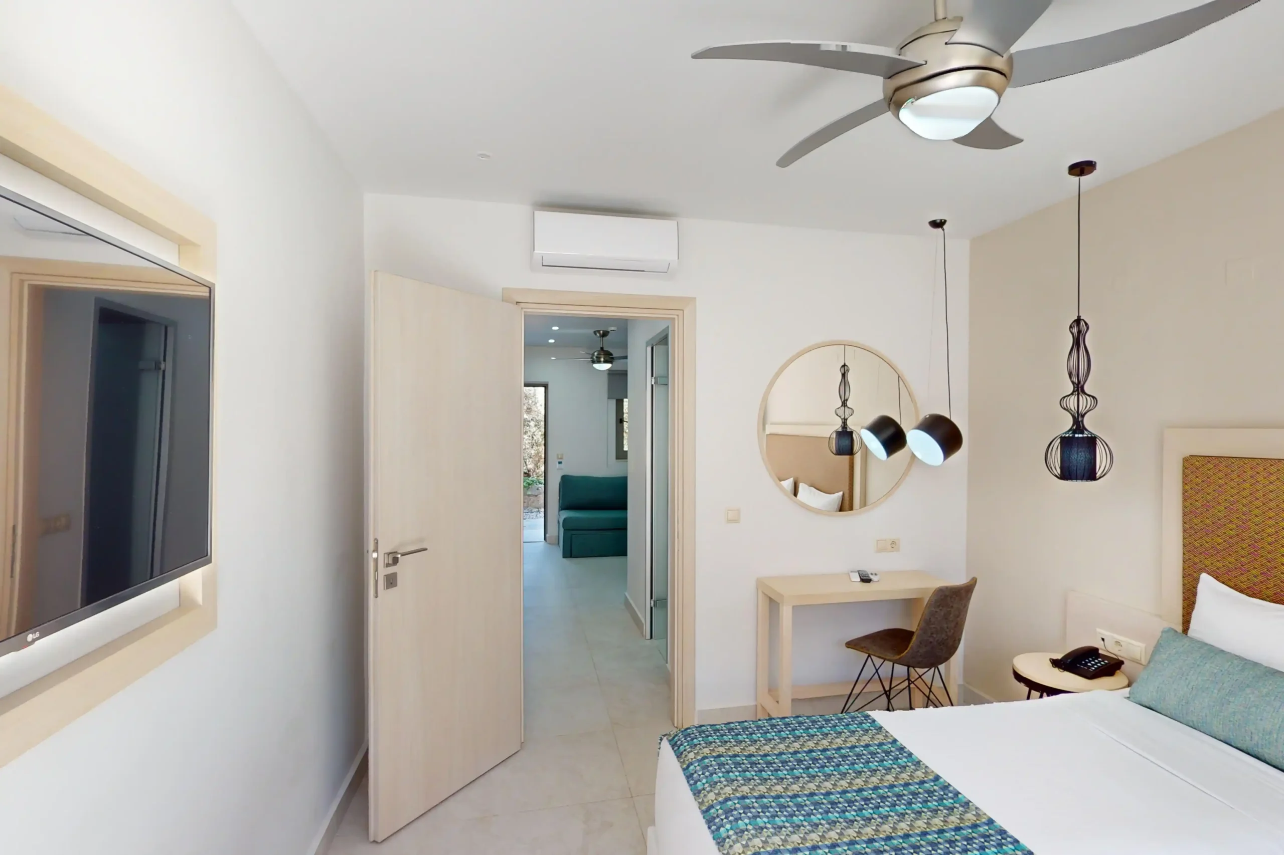 Fully refurbished and nestled within charming bungalows, this room features a private terrace enclosed by a fence and finished with a soft synthetic grass floor. Enjoy added comfort with a deckchair and parasol for relaxing outdoors in a safe, family friendly setting.